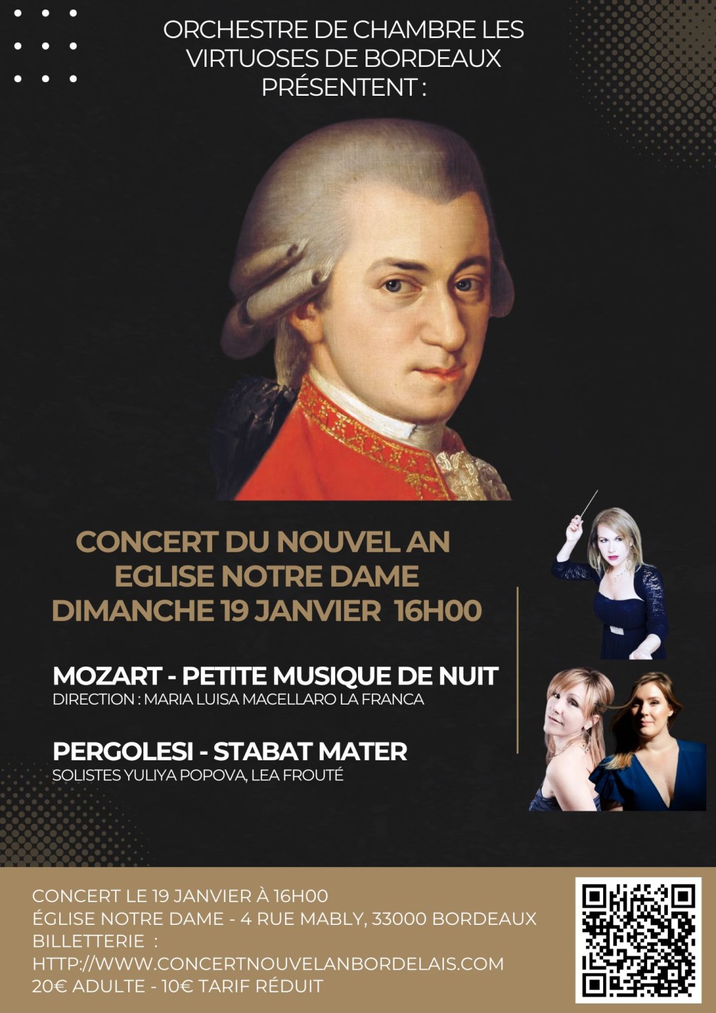 The Virtuosos of Bordeaux orchestra, under the direction of Maria Luisa Macellaro La Franca, presents a Bordeaux New Year’s concert on Sunday, December 17th at 4 PM at the Notre Dame church in Bordeaux.