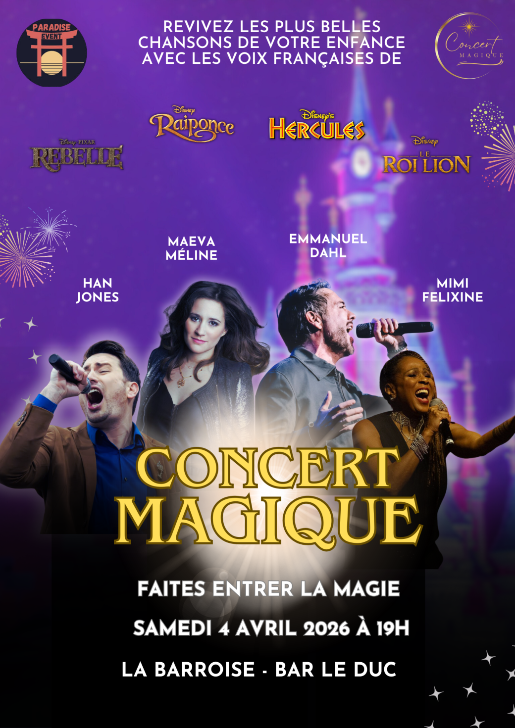 En effet, retrouver nous le Samedi 4 Avril à partir de 19h à La Barroise avec nos invités Maeva Meline, Mimi Felixine, Emmanuel Dahl et Han Jones pour revivre les plus belles chansons de votre enfance en revisitant l'univers Disney avec les voix officielles.