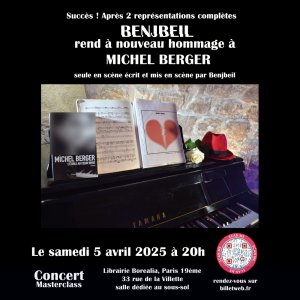 Lors de ce spectacle Benjbeil parle avec pudeur de Michel Berger à travers les chansons méconnues de cet artiste majeur, des textes puissants et actuels dont les délicates mélodies vous emportent. Benjbeil dévoile le lien fort et étonnant qui l’attache à Michel Berger et combien il a impacté sa vie et ses choix !