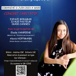 Concert Caritatif au profit des Associations Princesse Chana et Adrien. Nous aurons la chance d'accueillir en 1ère partie Elodie VANPEENE, Grand Maestro de N'oubliez pas les paroles et Alexis HOFFMANN, Golden Buzzer d'Incroyable Talent. Rébécca se produira ensuite avec ses musiciens "Go Up Group" et ses danseuses de la Diamond School et de la Strace Dance Center.Espace Miramar, Rue Pasteur, Cannes, FranceASSOCIATION PRINCESSE CHANA