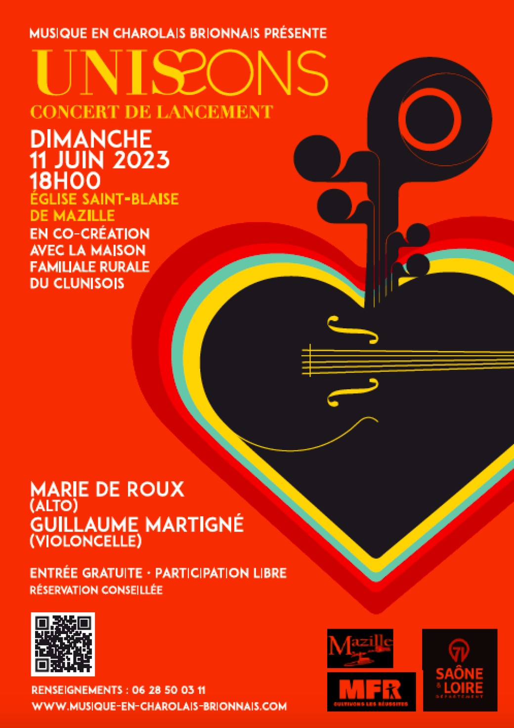Musique et Patrimoines en Charolais-Brionnais présente le concert de lancement du projet UnisSONS avec les musiciens Marie DE ROUX (alto) et Guillaume MARTIGNÉ (violoncelle). Oeuvres de Johann Sebastian Bach et Ludwig van Beethoven. Entrée gratuite, participation libre