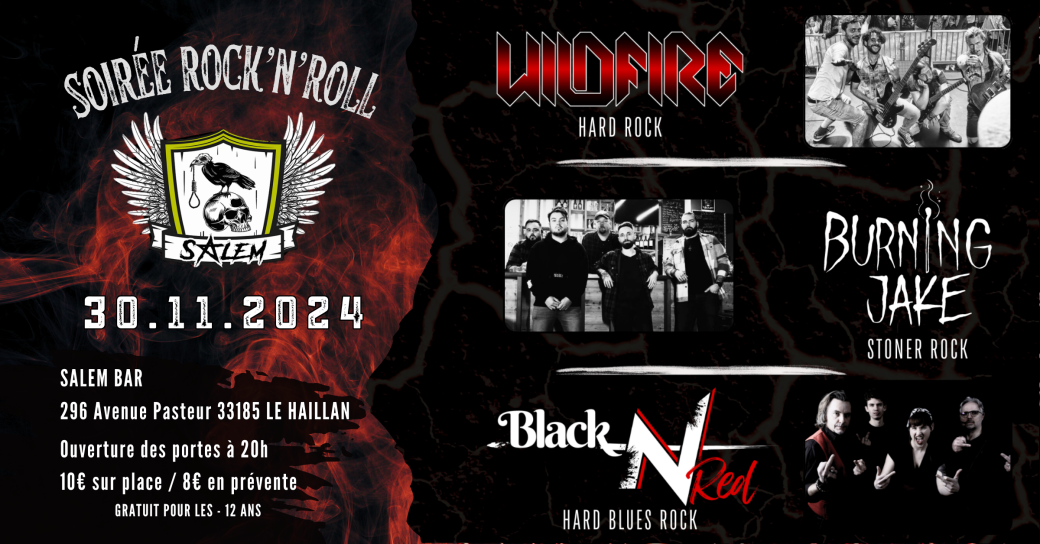 2024-11-30 20:00:002024-12-01 01:00:00Europe/ParisConcert WILDFIRE + BLACK'N RED + BURNING JAKEReservations on : https://www.billetweb.fr/concert-wildfire-blackn-red-burningjake