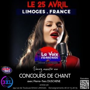Venez assister au concours de chant organisé par La Voix Française avec la présence de Pierre-Yves DUSCHENE. Le concours sélectionnera les meilleurs chanteuses et chanteurs dans plusieurs catégories pour la grande finale qui se déroulera à PARIS.194 Rue de Toulouse, Limoges, FranceLe 3XL