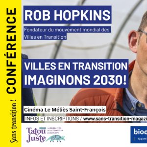Sans transition!, le Salon Tatou Juste et ses partenaires ont le plaisir de vous annoncer que Rob Hopkins sera présent à Saint-Étienne pour une conférence interprétée, le jeudi 20 novembre dès 20h au Cinéma Le Méliès Saint-François.