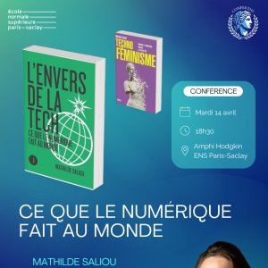 L'association Confer'ENS vous invite à une conférence de la journaliste Mathilde Saliou, spécialiste du numérique et autrice de l'ouvrage "L'envers de la tech", paru en 2025. Dans ce dernier, elle met en évidence les conséquences sociales et environnementales du numérique afin de remettre en question notre rapport à la tech. La conférence se déroulera sous forme de questions-réponses avec des membres de Confer'ENS, suivi d'un temps de questions du public.