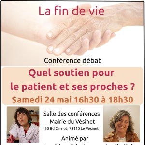 Estelle Destrée, médecin en soins palliatifs à Mantes la jolie, et Axelle Huber, coach, aidante et auteur du Vésinet, viendront présenter les soins, aides et soutiens qui sont aujourd'hui disponibles pour le malade en fin de vie et ses proches. Les échanges seront animés par Rémy Frèrebeau.