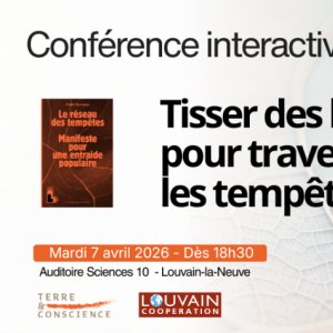 2026-04-07 18:30:00 2026-04-07 22:00:00 Europe/Brussels Conférence interactive avec Pablo Servigne Reservations on : https://www.terreetconscience.be/ -- Tisser des liens pour traverser les tempêtes  Un partenariat entre Louvain Coopération et Terre & Conscience*. « Et si, dans un monde de plus en plus instable […], la meilleure préparation aux crises était de miser sur nos liens sociaux plutôt que sur les ressources matérielles ? C’est la proposition du Réseau des tempêtes : que chacun se tisse un robuste filet de sécurité sociale, composé d’un maximum de liens avec ses amis, sa famille, ses voisins, les secours, les autorités… ou avec n’importe qui ! » - Pablo Servigne, Le Réseau des tempêtes : Manifeste pour une entraide populaire (2025) Rejoignez-nous pour une conférence interactive exceptionnelle en présence de Pablo Servigne - chercheur, auteur et conférencier reconnu pour ses travaux sur l’entraide, la résilience, l’écologie et les vulnérabilités de nos sociétés. Il sera accompagné d’un panel de témoins et d’organisations ayant vécu ou mis en place des réseaux d’entraide face aux crises. Une soirée pour comprendre, ressentir, e… Auditoire Sciences 10 - Place des Sciences 2, Louvain-la-Neuve Terre & Conscience ASBL