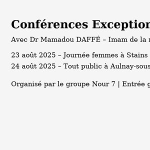 L’équipe NOUR 7 a l’honneur d’organiser deux conférences exceptionnelles avec le Dr Mamadou DAFFÉ, Imam de la mosquée du Mirail de Toulouse.