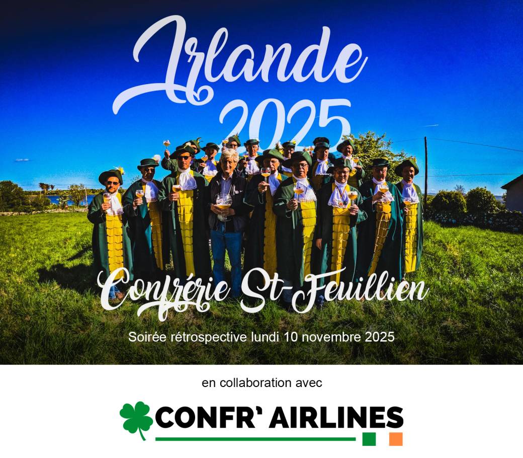 Vous êtes sur le point de réserver vos sièges pour un vol un peu particulier : la soirée rétrospective Irlande, organisée par la Confrérie St-Feuillien et sa filiale aérienne Confr’Airlines.
