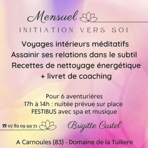 2026-09-19 09:00:00 2026-09-19 16:00:00 Europe/Paris Connexion à SOI Reservations on : https://www.billetweb.fr/connexion-a-soi1 -- Atelier Connexion à Soi Se Libérer pour s'épanouir  Programme : meltingpot de relaxations, méditations guidées pour   couper avec les relations toxiques et dépendance affective, mais aussi   d autres thèmes pour améliorer et optimiser ses potentiels pour   atteindre ses rêves.  Lors de mes accompagnements individuels mes consultants bénéficient de ce programme qui les fait avancer grandement dans leur parcours.   Je vous propose ici d'en bénéficier à votre tour en collectif et de pouvoir   échanger si vous le souhaiter après chaque expérience ou juste de vous   plonger dans la vivance de l'expérience unique.  Pour entretenir les effets : recettes de nettoyage énergétique pour attirer plus de chance.  Merci de me contacter pour me faire part des thématiques ou domaines qui vous intéressent : - santé - développement personnel - boost abondance / projet professionnel / reconversion - spirituel - tous les thèmes  16 avril 2023 : développement personnel (confiance en soi etc...) 30 avril … Hyères, Var, France BRIGITTE CASTEL