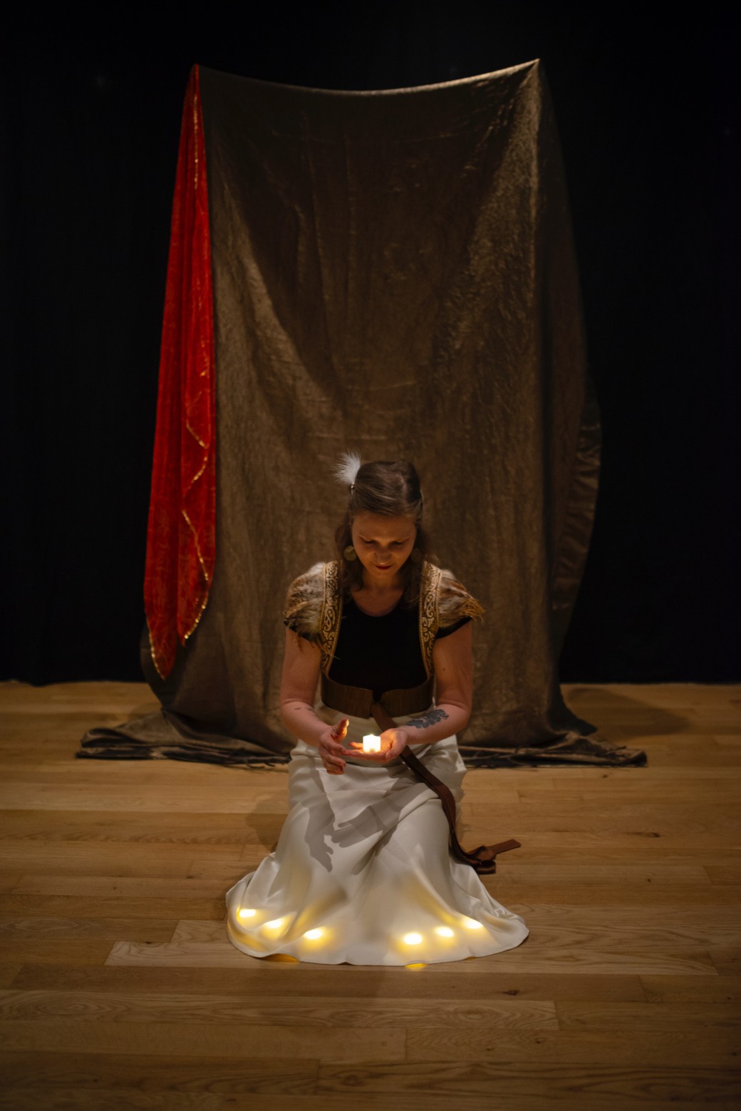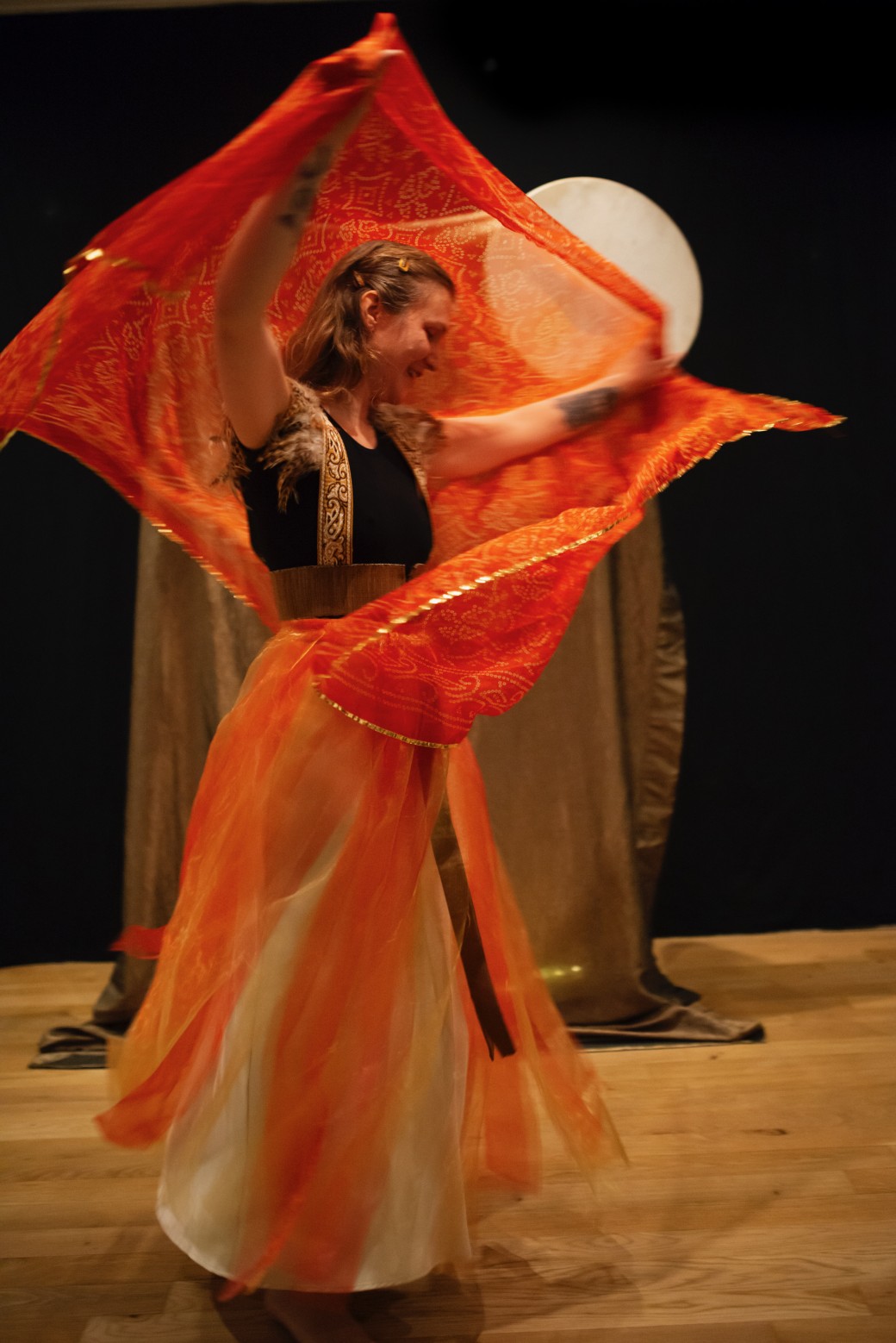 Sandrine agrémente l'histoire par des chants iraniens, une danse iranienne et des moments avec le daf, percussion iranienne.