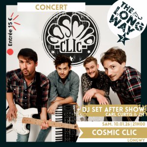 Composé de Pierrot (batterie), Charly (basse), Tom (claviers) et Jul (guitare-chant), COSMIC CLIC, vous propose un concert énergique au son des plus grands standards de la pop, du rock et de la funk... avec comme un petit goût de reviens-y-groovy-baby !