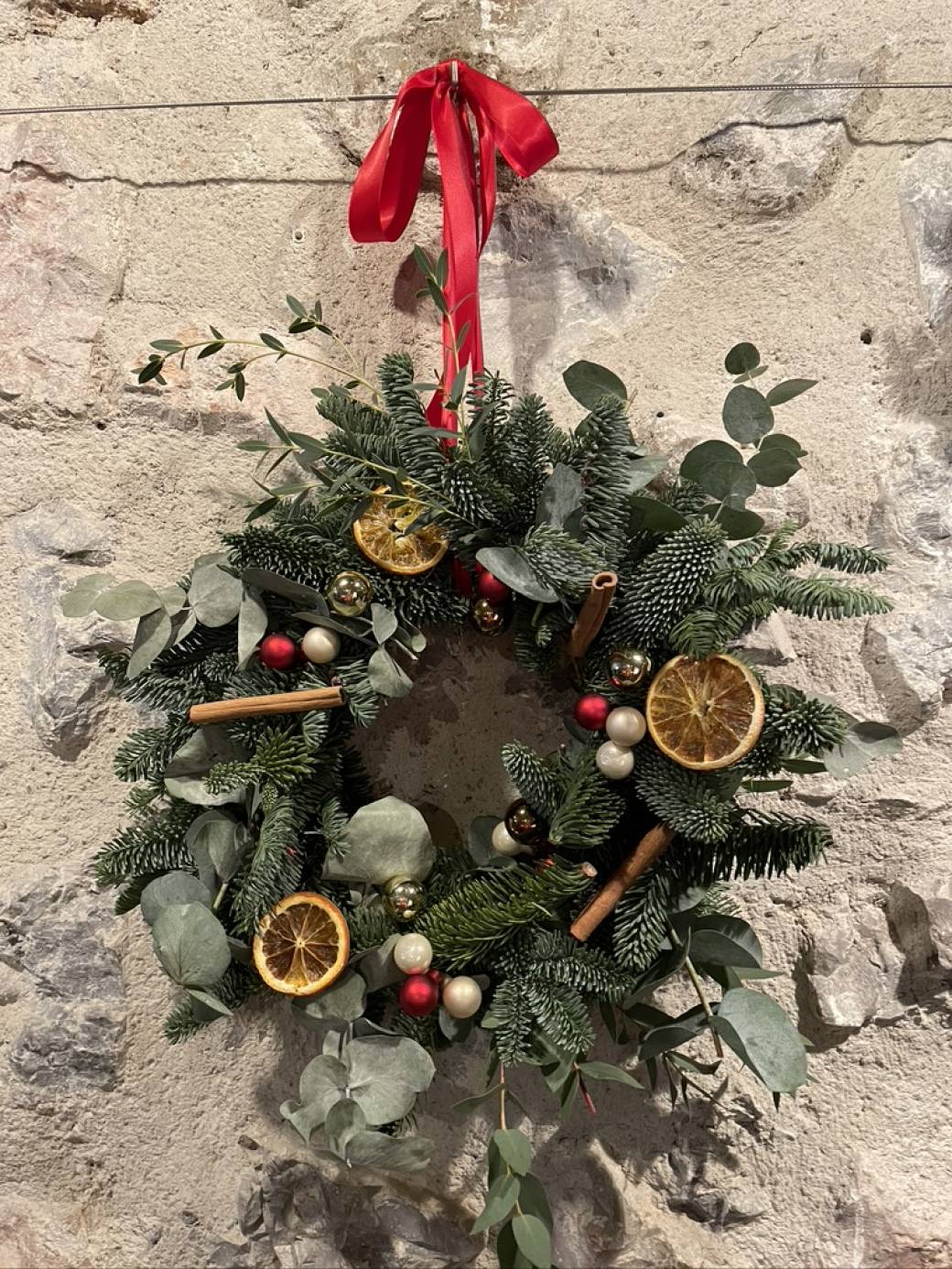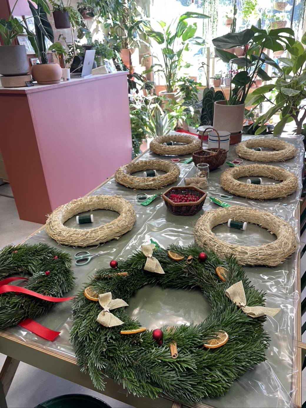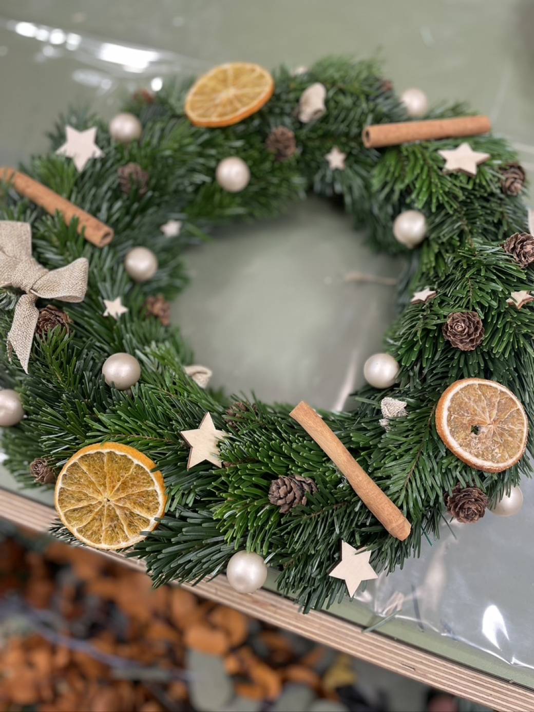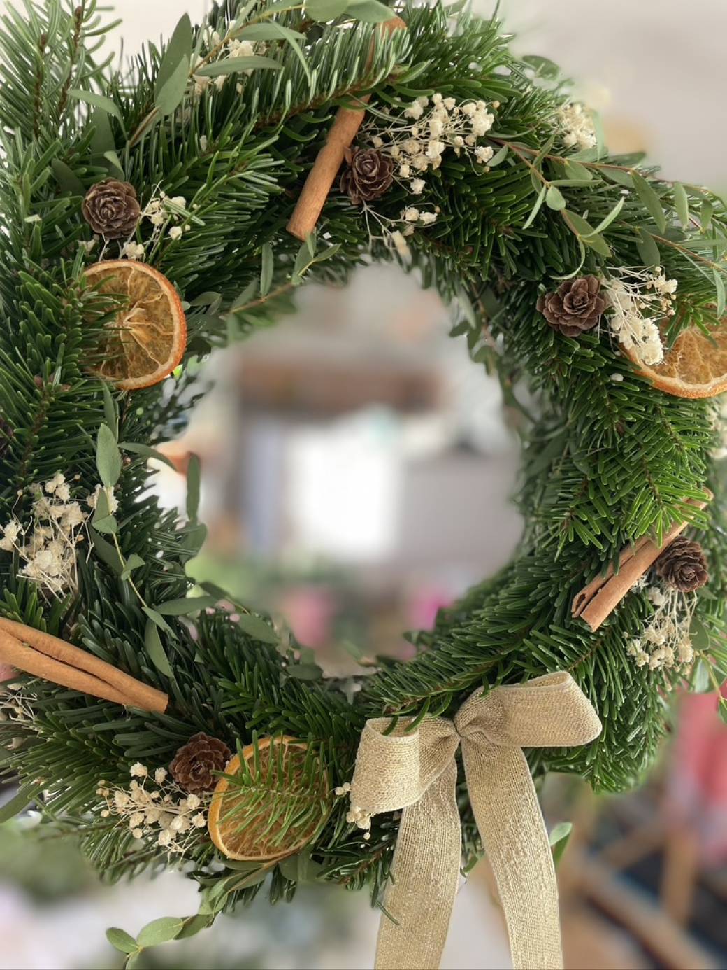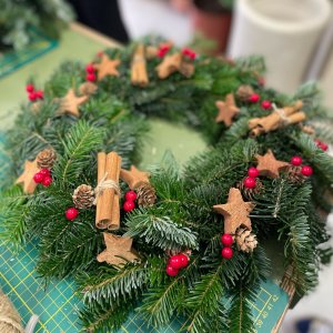 Viens créer une superbe couronne de Noël à suspendre. Une composition de sapin frais à décorer de façon personnel selon un choix varié d'éléments séchés et colorés.