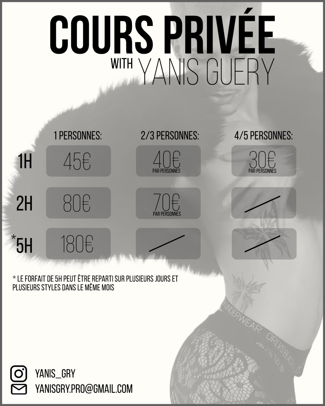 2026-04-18 14:00:00 2026-04-22 18:00:00 Europe/Paris Cours privée 18 & 22 avril Reservations on : https://www.billetweb.fr/cours-privee-18-22-avril -- Pensez à bien regarder les informations tarifaire ainsi que l'heure que vous avez sélectionné avant de réserver  pour s'assurer qu'il n'y est aucun souci lors de votre réservation    Sélectionnée uniquement l'horaire que vous souhaitez réservé:   exemple:   -je veux faire 1h de cours privée, je peux donc sélectionner le créneau horaire que je souhaite    -je veux faire 2h de cours privée, je peux donc sélectionner deux créneaux horaires qui se succèdent (ex: 14h00 à 15h00 et 15h15 à 16h15)   pour toute question, vous pouvez me contacter directement sur Instagram: @yanis_gry   merci à vous :)  277 Avenue de la Capelette, Marseille, France Yanis Guery EI