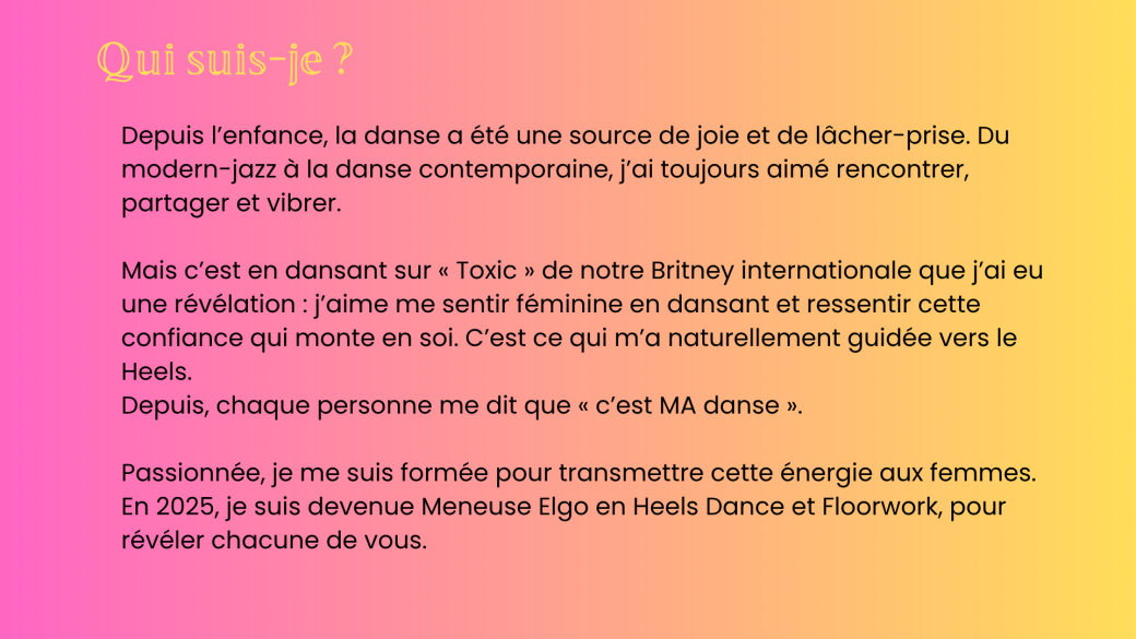 2026-01-09 19:30:00 2026-06-19 20:30:00 Europe/Paris Cours réguliers Heels Dance Elgo - VENDREDI 19h30 à 20h30 Reservations on : https://www.billetweb.fr/cours-reguliers-heels-dance-elgo-vendredi-19h30-a-20h30 --  ** UNE SURPRISE ATTEND LES 5 PREMIERES INSCRITES **   Le concept Heels by Elgo ? Un concept unique mêlant le fitness à la danse dans une ambiance fun, bienveillante et qui permet de lâcher-prise pour aller à la rencontre de sa féminité. En talons ou en baskets, viens comme tu as envie !   Grâce aux cours hebdo - hors vacances scolaires -, tu apprendras : - les techniques et mouvements du heels dance de manière approfondie - une nouvelle chorégraphie à chaque période scolaire, tout en pratiquant une activité physique régulière.    Tu n'es plus qu'à quelques clics de rejoindre cette belle communauté ! --> N'oublie pas de finaliser avec le bulletin d'inscription ci-dessous pour valider (Google forms).   Let's show !! Espace Arc-en-Ciel, Place des Vosges, Séné, France Heels 56