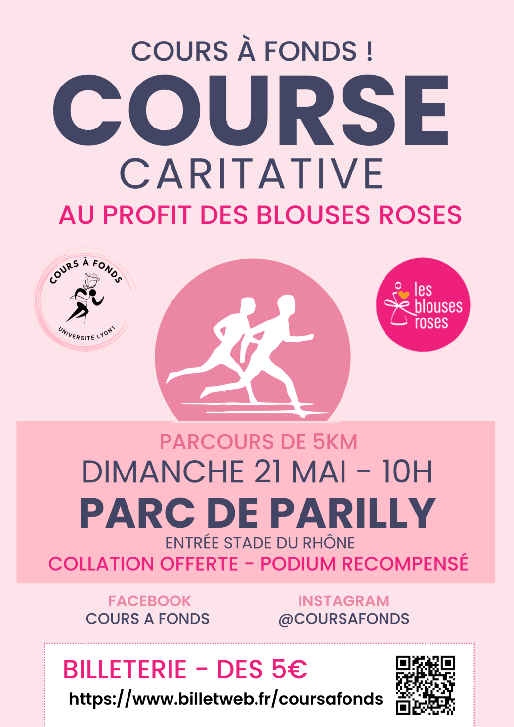 Nous sommes 5 étudiantes de l'Université Lyon I qui organisent une course caritative au profit de l'association des Blouses Roses. Cette association intervient auprès des enfants hospitalisés et des personnes âgées en EHPAD afin de leur apporter du soutien, de la joie, du réconfort..