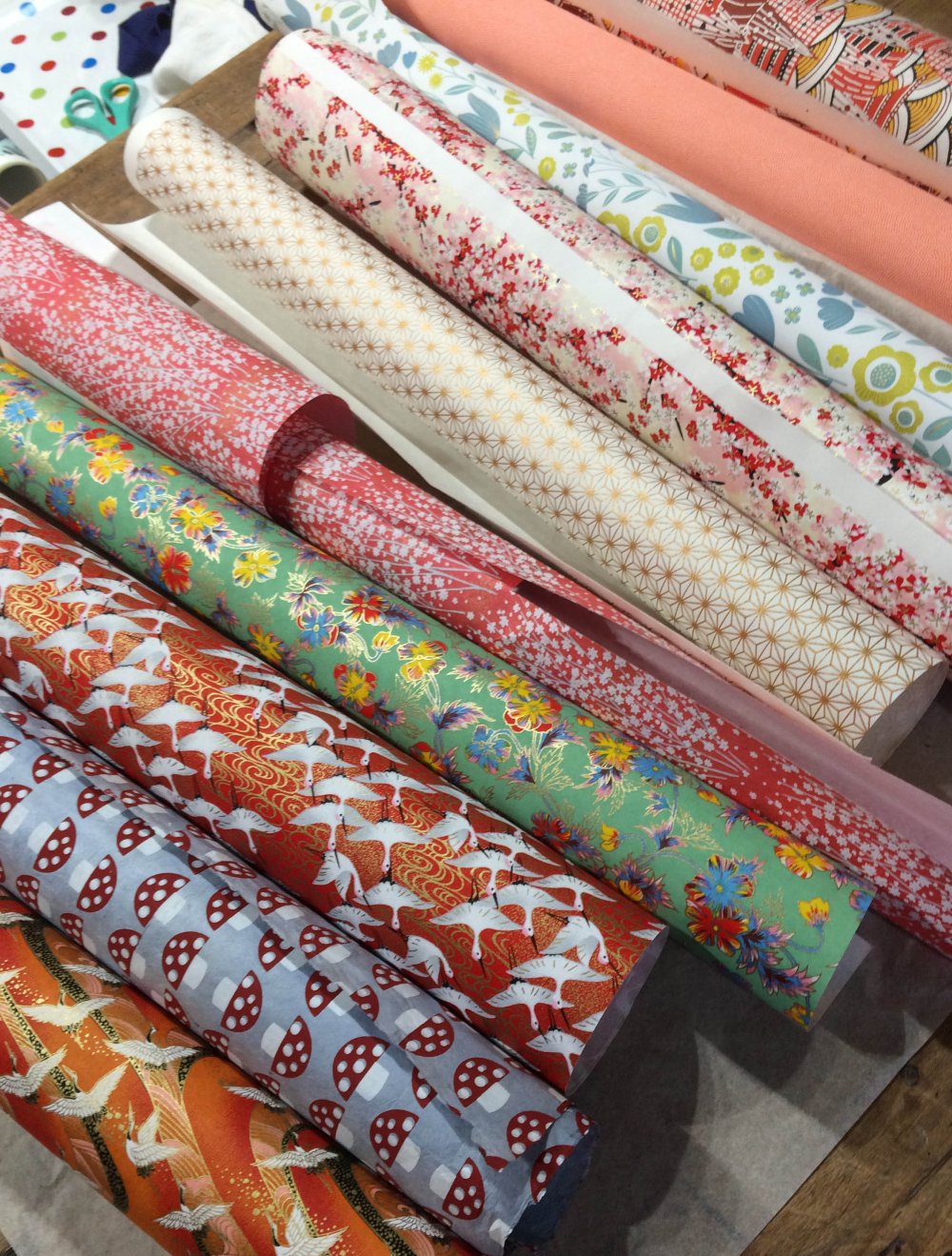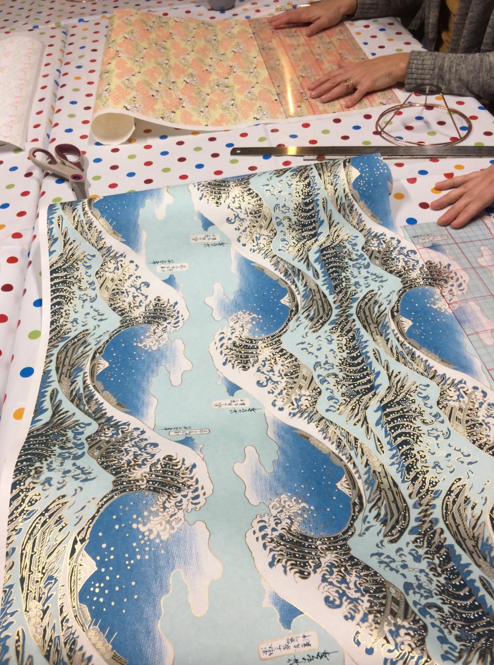 Pour l'atelier vous pourrez choisir parmi une large gamme de papiers aux motifs et coloris très variés. Puis guidé.es pas à pas, vous découvrirez les étapes de fabrication : édition du patron, découpe du polyphane, ajustement, contrecollage et montage de l'abat-jour.
