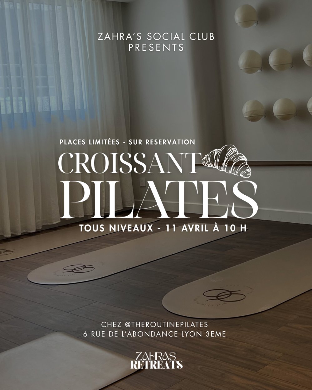 2026-04-11 10:00:00 2026-04-11 12:30:00 Europe/Paris Croissant & PILATES Reservations on : https://www.billetweb.fr/croissant-pilates --   ﷽   Chères sœurs, Nous sommes heureuses de vous annoncer notre deuxième événement de Zahra’s Social Club à Lyon.    Cette fois-ci, nous vous invitons à vivre un moment de bien-être et de reconnexion, un moment un peu différent : une douce matinée pour découvrir le Pilates ensemble, puis prolonger ce beau moment autour d’un petit-déjeuner gourmand, entre croissants, échanges et sisterhood.     Programme:  50 minutes de Pilates au sol, guidées par @theroutinepilates, Brunch imaginé avec soin.   Cet événement est organisé par Zahra’s Retreats, un espace dédié aux femmes, créé pour faire fleurir les âmes à travers la sororité, la nature, la créativité et le partage. À travers des retraites, des randonnées et des événements, Zahra’s Retreats souhaite offrir des espaces sûrs, inspirants et ressourçants, où chaque femme peut se reconnecter à elle-même, aux autres et à ce qui nourrit son cœur.    Visiter notre page-> INSTAGRAM   Nous vous attendons le 11 avril à 10h00 chez @theroutinepila… 6 Rue de l'Abondance, Lyon, France Zahra's Retreats