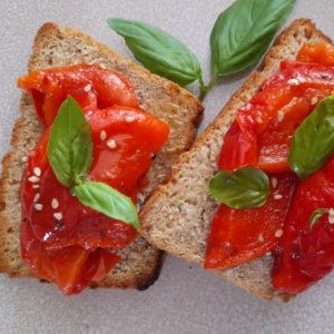> antipasti - poivrons marinés, tapenade, crackers maison et caponata