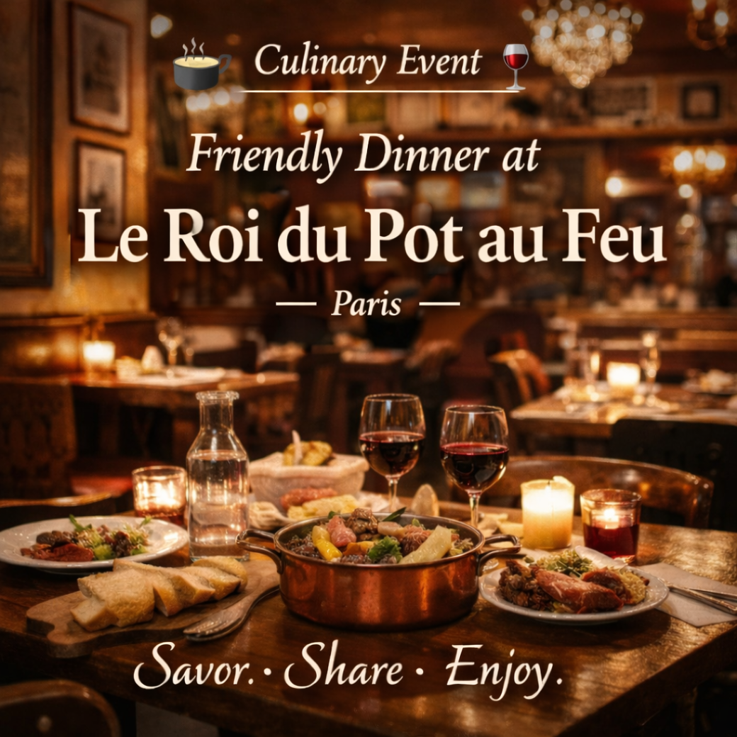 Un dîner gastronomique convivial réunissant 8 convives autour de la cuisine française traditionnelle dans un bistrot parisien.