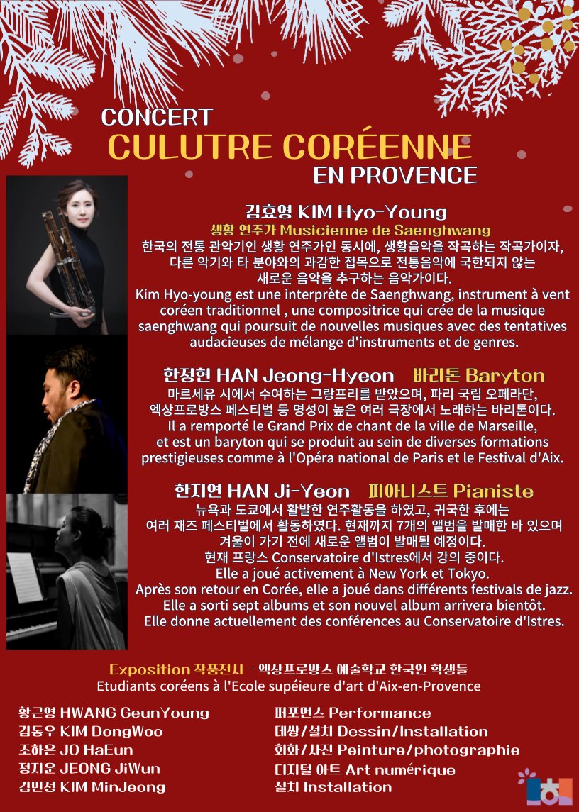 2022-01-16 15:00:00 2022-01-16 18:00:00 Europe/Paris Culture Coréenne En Provence Reservations on : https://www.billetweb.fr/culture-coreenne -- Aixagone Space Evènementiel, Saint-Cannat, France RESIDENTS COREENS DE PROVENCE