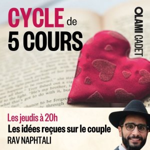 2025-11-20 20:00:00 2025-12-25 21:00:00 Europe/Paris Cycle 5 cours - Idées reçues sur le couple Reservations on : https://www.billetweb.fr/cycle-5-cours-idees-recues-sur-le-couple -- - Il faut aimer l'autre plus que soi - Les écarts de pratique religieuse dans le couple - Plus de passion, mort du couple  - Qui a le dernier mot - Choix du conjoint : semblable ou différent - La place de chacun dans le couple   Des idées reçues dont il est parfois difficile de se détacher, des réflexions fondamentales autour du mariage.  Rav Naphtali répondra à toutes tes questions et sera à ton écoute pour éclaircir tes doutes. Il adaptera chaque cours selon tes réponses et tes besoins.  Tu l'auras compris, un cycle de cours spécialement conçu pour toi et avec toi !    Suivi d'un repas offert Tous les jeudis à 20h centre Olami Cadet pour les 23-30 ans. Inscription obligatoire : olami-cadet-nation.fr - Olami Cadet