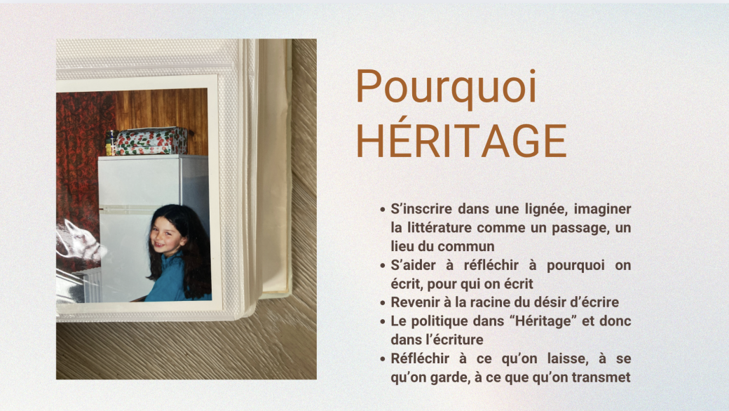 Pour les ateliers d'écriture/workshops du mois de Novembre, j'ai conçu un cycle en 4 séances autour du thème "HÉRITAGES", à partir de textes choisis et des références esthétiques.