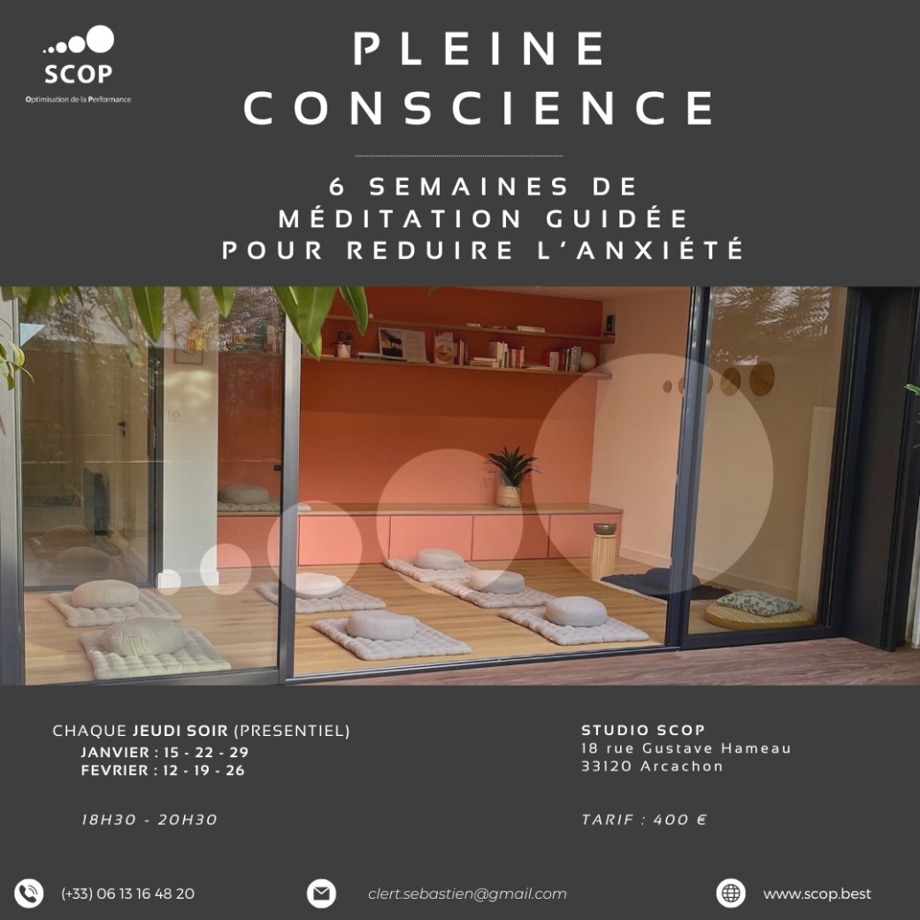 Reservations on : https://www.billetweb.fr/cycle-mindfulness-arcachon-jeudi-soir-hiver-2026 -- Chaque jeudi soir, en présentiel à Arcachon, de 18h30 à 20h30 séance 1 : jeudi 15 janvier 2026 séance 2 : jeudi 22 janvier 2026 séance 3 : jeudi 29 janvier 2026 séance 4 : jeudi 12 février 2026 séance 5 : jeudi 19 février 2026 séance 6 : jeudi 26 février 2026