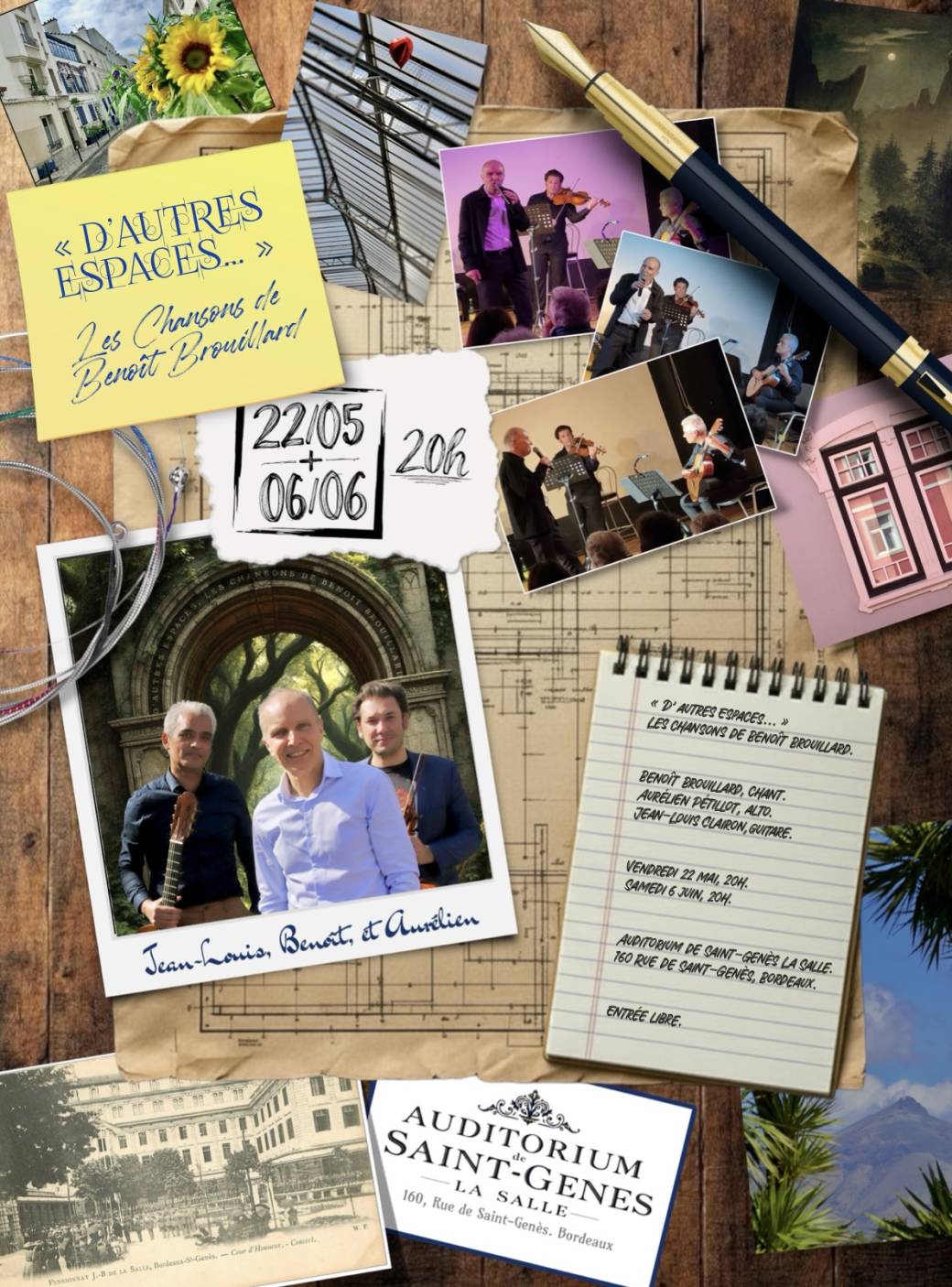 Avec « D'Autres Espaces... » Benoît Brouilard, professeur de philosophie, et auteur/compositeur/interprète prolifique, propose un nouveau spectacle mettant en valeur son bouillonnement créateur. Ses chansons expriment un mariage parfait entre une poésie féconde, humaniste, et virtuose, et des mélodies mémorables et élancées. Entre nuages et franc soleil, délicatesse, profondeur et humour, fort d’influences philosophiques et musicales fertiles et variées, Benoît Brouillard distille dans ces chansons les expériences, la curiosité, et les souvenirs de toute une vie, ainsi que les enseignements de Platon, La Fontaine et Descartes, et s’inscrit naturellement dans la lignée d’un Trénet, d’une Barbara, de Nougaro et de Ferrat.