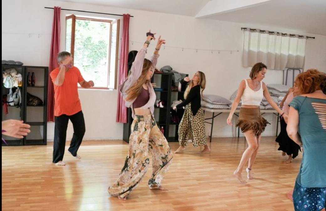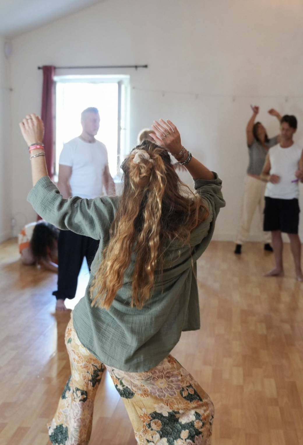 - Une phase de danse libre, semi-guidée par la musique et la voix, avec une montée en énergie, un moment de lâcher-prise, puis une redescente progressive