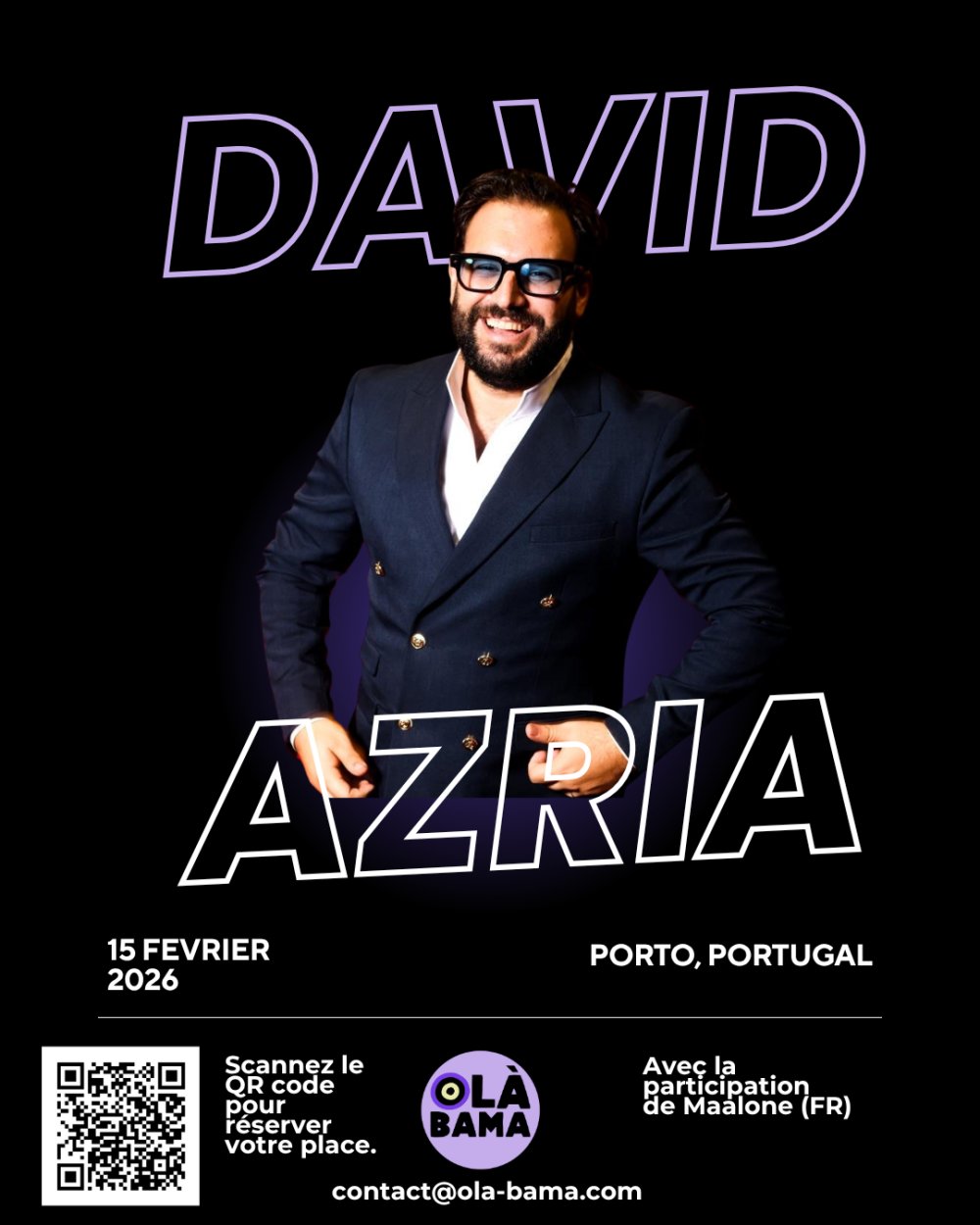 2026-02-15 19:00:00 2026-02-15 22:00:00 Europe/Lisbon DAVID AZRIA À PORTO Reservations on : https://www.billetweb.fr/david-azria-sur-scene -- David Azria débarque pour la première fois à Porto ! Après un brillant parcours dans la finance internationale – diplômé, trader à la HSBC, costume-cravate et tableur Excel – David réalise vite que son vrai terrain de jeu… c’est la scène.   Il troque les chiffres contre les punchlines et se lance dans le stand-up, écumant les scènes parisiennes pendant plusieurs années. On a ensuite pu le voir dans “Vendredi tout est permis” (TF1), sur Comédie+ dans le “Comédie Club Tour : Kev Adams”, ou encore récemment sur W9 dans “La Grosse Rigolade”.   Aujourd’hui, David  fait une escale exceptionnelle à Porto pour une soirée unique !   Un humour cash, sincère et sans filtre alors ne manquez pas ce show inédit !   Pour l’avant-show de David Azria, nous sommes heureux d’accueillir Maalone (FR). DJ aux sélections raffinées, il sait créer une atmosphère à la fois immersive et vibrante. Un prélude musical d’exception, pensé pour ouvrir la voie à une soirée inoubliable.   Renaissance Porto Lapa Hotel, Rua de Cervantes, Porto, Portugal Olà Bama