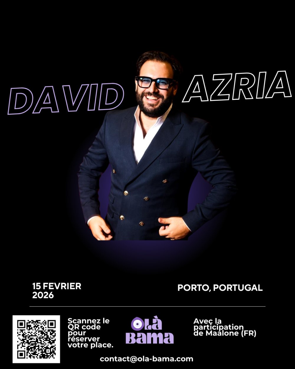 2026-02-15 19:00:00 2026-02-15 22:00:00 Europe/Lisbon DAVID AZRIA À PORTO Reservations on : https://www.billetweb.fr/david-azria-sur-scene -- David Azria débarque pour la première fois à Porto ! Après un brillant parcours dans la finance internationale – diplômé, trader à la HSBC, costume-cravate et tableur Excel – David réalise vite que son vrai terrain de jeu… c’est la scène.   Il troque les chiffres contre les punchlines et se lance dans le stand-up, écumant les scènes parisiennes pendant plusieurs années. On a ensuite pu le voir dans “Vendredi tout est permis” (TF1), sur Comédie+ dans le “Comédie Club Tour : Kev Adams”, ou encore récemment sur W9 dans “La Grosse Rigolade”.   Aujourd’hui, David  fait une escale exceptionnelle à Porto pour une soirée unique !   Un humour cash, sincère et sans filtre alors ne manquez pas ce show inédit !   Pour l’avant-show de David Azria, nous sommes heureux d’accueillir Maalone (FR). DJ aux sélections raffinées, il sait créer une atmosphère à la fois immersive et vibrante. Un prélude musical d’exception, pensé pour ouvrir la voie à une soirée inoubliable.   Teatro Sá da Bandeira, Rua de Sá da Bandeira, Porto, Portugal Olà Bama