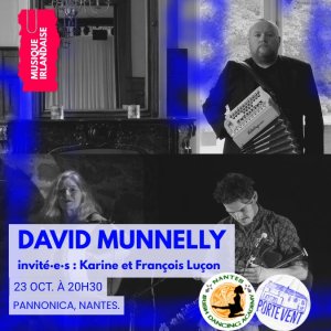 David Munnelly, accordéoniste irlandais reconnu, sera à Nantes pour vous proposer une soirée riche, accompagné de deux invité·e·s de marque : Karine Luçon et François Luçon, deux musicien·ne·s spécialistes de la musique irlandaise, bien connu·e·s sur la scène nantaise.