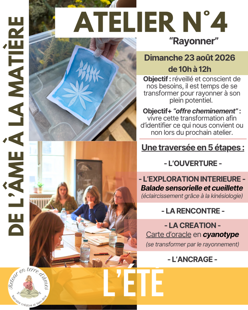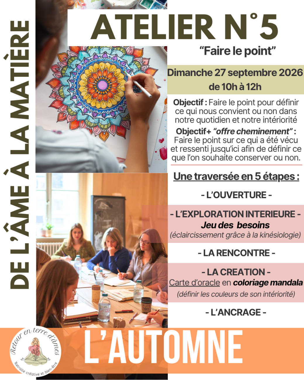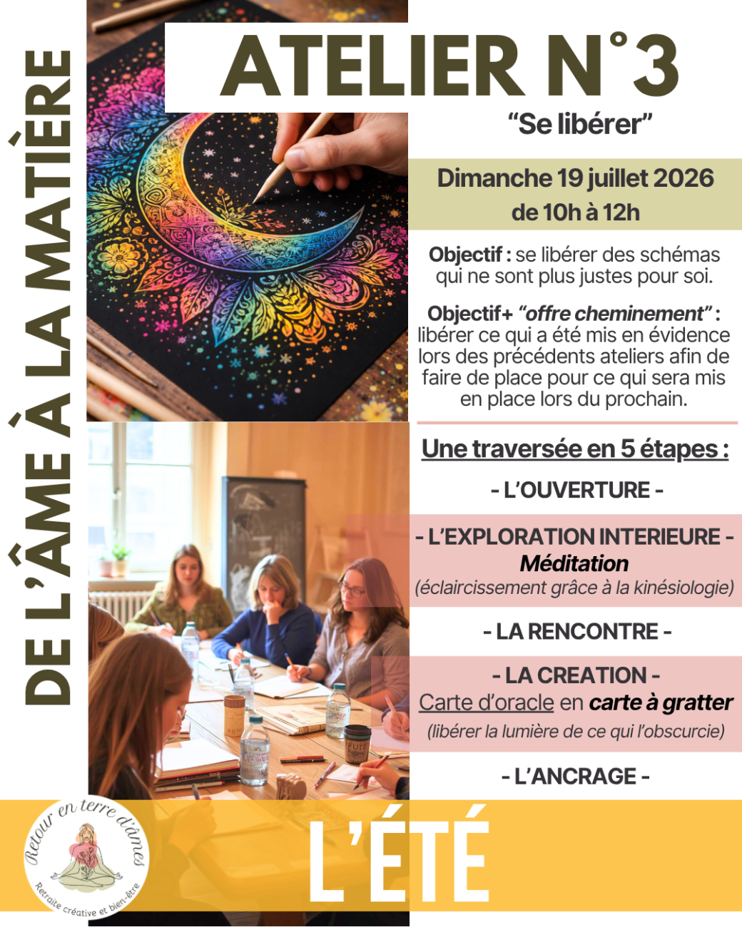 > L'ancrage : on clôture l'atelier et on se prépare à revenir au quotidien en gardant ancrer les énergies positives vécues.