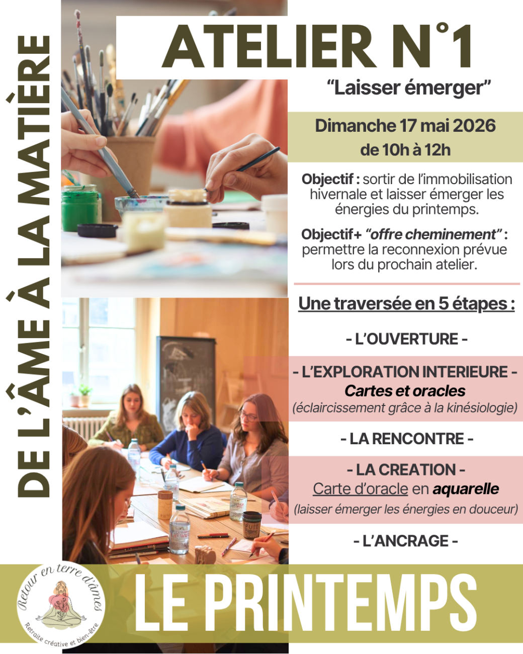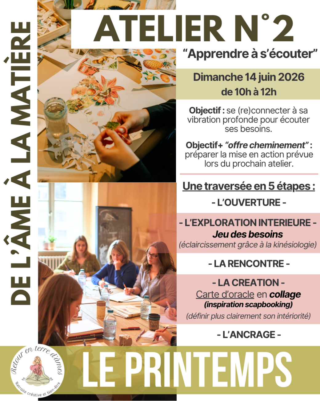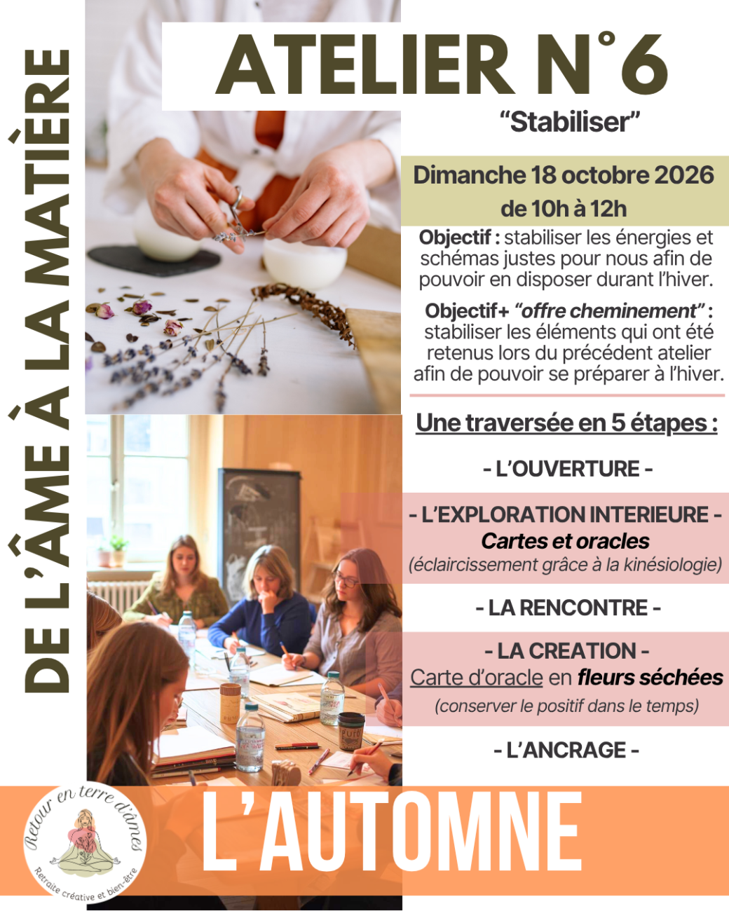 > L'ancrage : on clôture l'atelier et on se prépare à revenir au quotidien en gardant ancrer les énergies positives vécues.