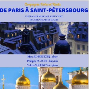De Paris à Saint-Pétersbourg, nous vous convions à une balade musicale à deux voix, un ténor et un baryton interprétant des duos slaves et français, d'inspiration tour à tour romantique, folklorique ou poétique. Au programme, Dvorak et Tchaïkovsky, Saint-Saens, Massenet, Chausson ... Des pièces pour piano seul et des airs solo complètent ce programme qui rend hommage à la musique de la fin du 19 ème siècle. Avec Marc Schweitzer, ténor, Philippe Scagni, baryton et Valéria Suchkova, pianiste.