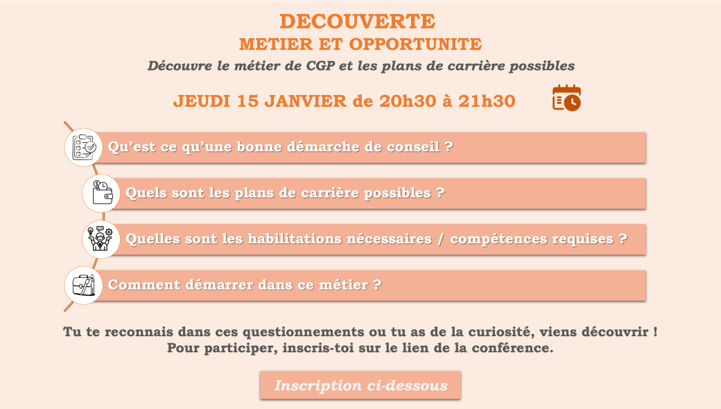 2026-01-15 20:30:002026-01-15 21:30:00Europe/ParisDécouverte métier et opportunité: devenir CGP !Reservations on : https://www.billetweb.fr/decouverte-metier-et-opportunite-devenir-cgp