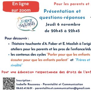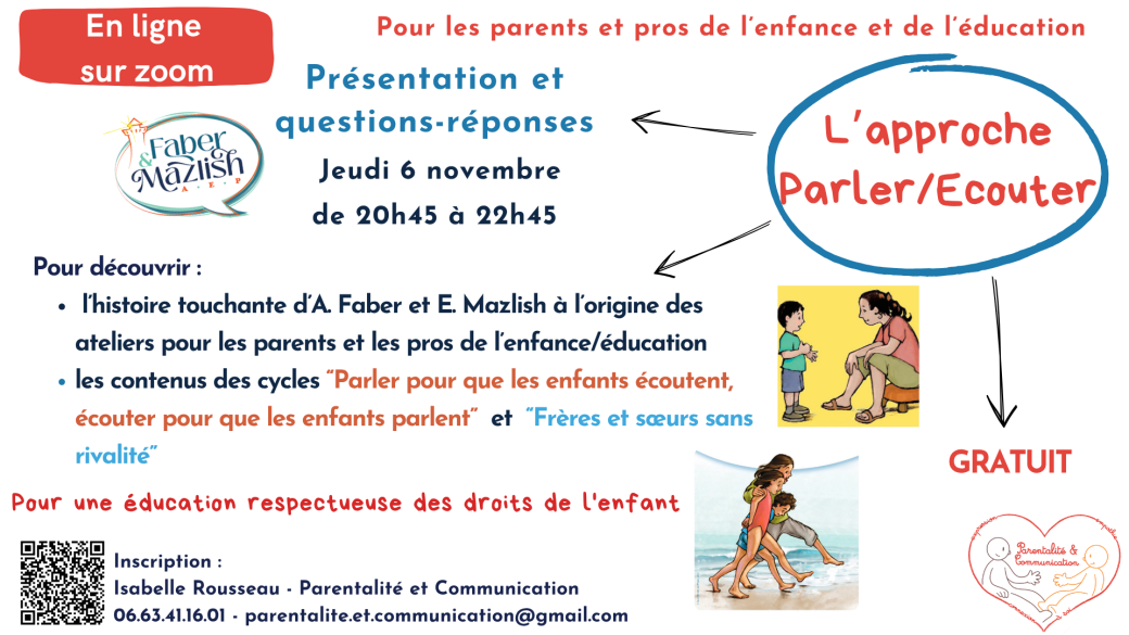 Vous en saurez plus sur l'origine de cette approche humaniste et sur le contenu du cycle Parler pour que les enfants écoutent, écouter pour que les enfants parlent et du cycle Frères et sœurs sans rivalité !