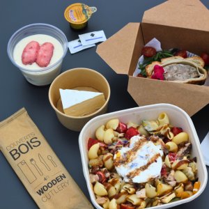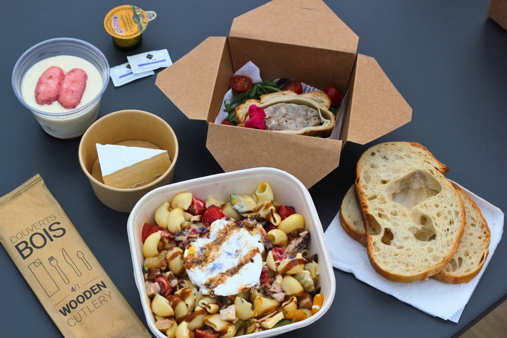 Menu of the moment : Slice of artisanal pâté en croûte & green salad | Chicken and vegetable pasta salad with burrata | Brie served with bread | Tiramisu with pink Reims biscuits