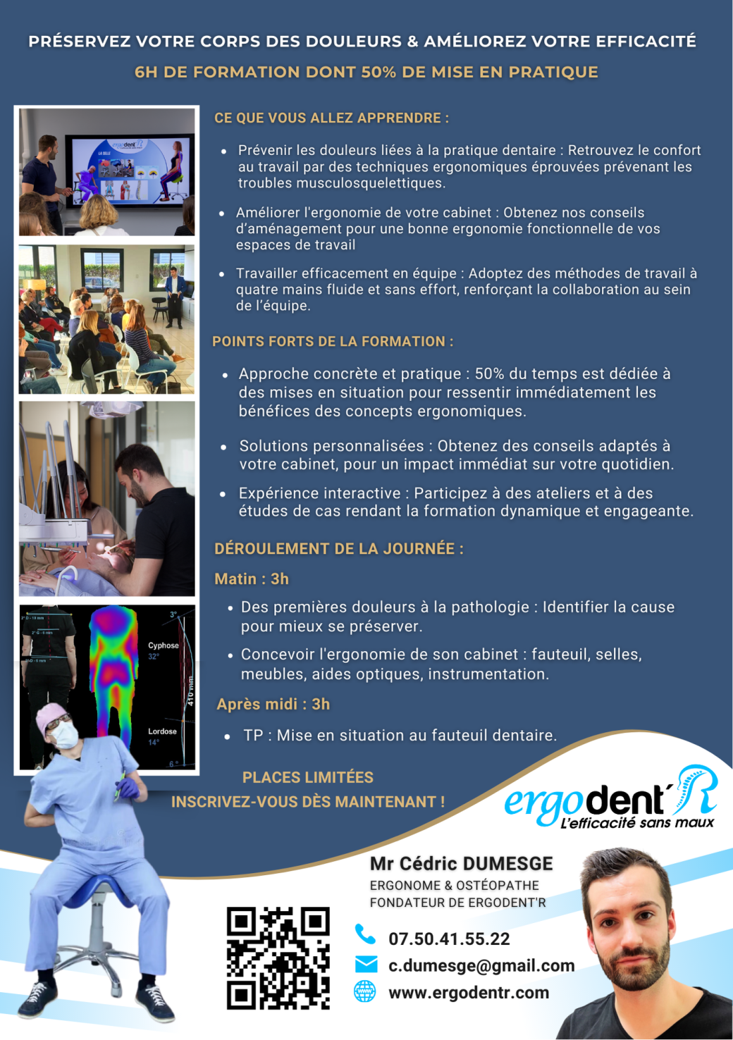 2026-09-30 09:00:00 2026-09-30 16:30:00 Europe/Paris Journée de l'ergonomie dentaire - Toulouse Reservations on : https://www.billetweb.fr/denta3d -- Cédric DUMESGE - Ergonome & Ostéopathe Posturologue Fondateur de Ergodent'R - Cabinet d'expertise en ergonomie et posturologie pour professionnels du dentaire.   Diplômé de l'Ecole Supérieure d'Ostéopathie de Paris (ESO) Master 2 Biomécanique et Santé  Master 2 Ergonomie   Ergodent'R accompagne les dentistes et les assistant(e)s dentaires dans la prévention des douleurs chroniques en analysant leurs pratiques et l'ergonomie de leurs cabinets afin de transmettre une méthodologie posturale adaptée sur mesure.  Denta 3D, 13 ter Chemin du Chapitre, Toulouse, France Eric Savignac - Denta3D