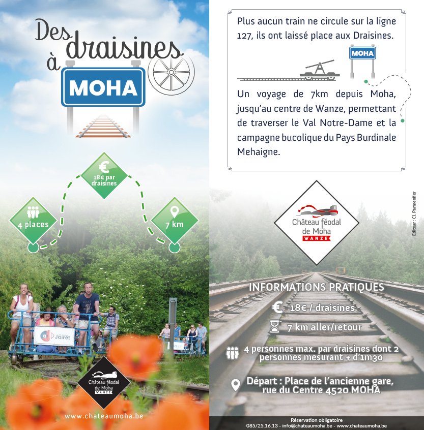 2022-07-03 11:00:00 2022-08-28 16:00:00 Europe/Brussels Des draisines à Moha Reservations on : https://www.billetweb.fr/des-draisines-a-moha2 -- "Rail bike" ou vélo sur rail.   Pédalez le long de l'ancienne ligne 127 à travers le Parc Naturel Burdinale-Mehaigne. Balade bucolique et originale de 7km.   4 personnes max par draisine dont 2 mesurant plus d'1m30 Moha, Wanze, Belgique Château féodal de Moha