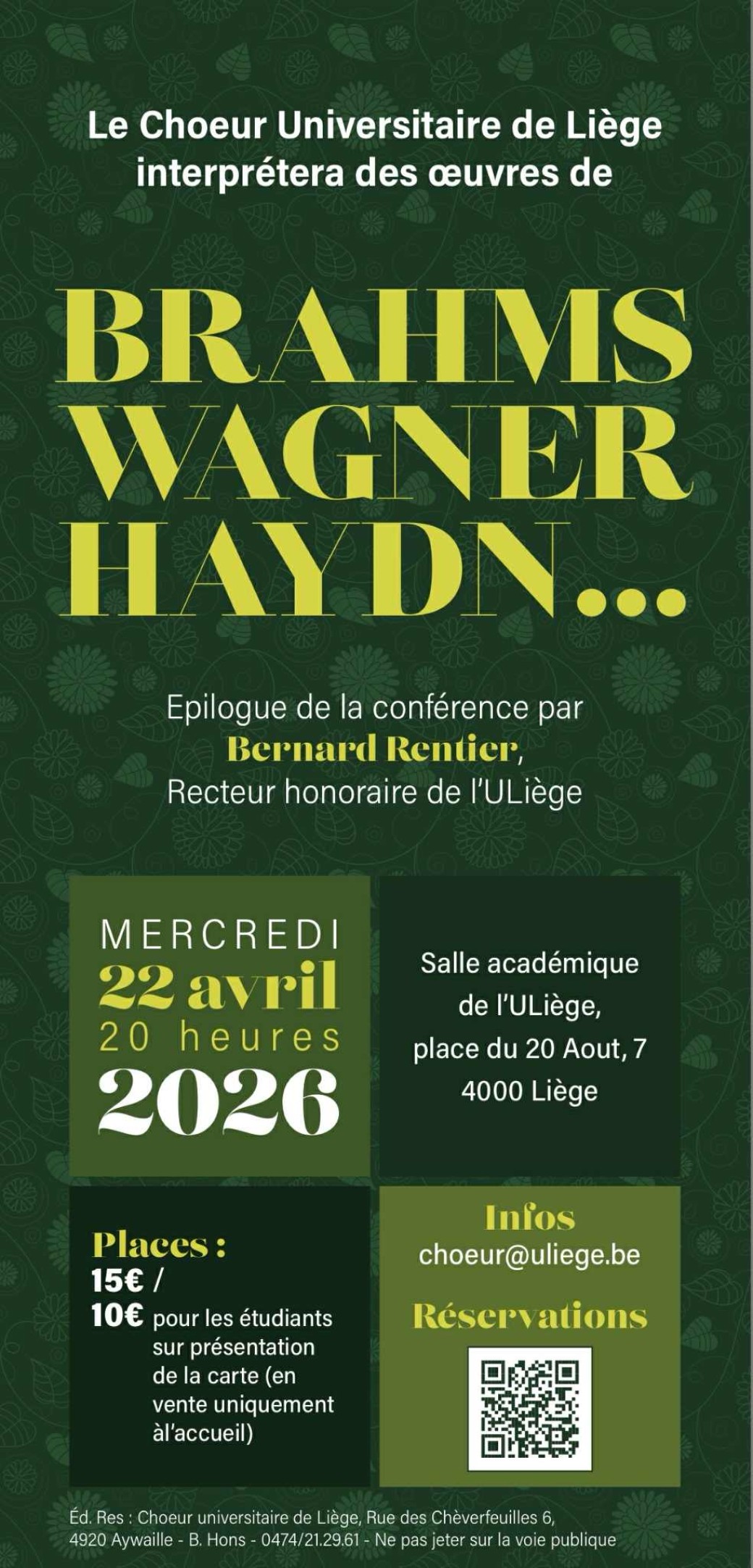 Bernard Rentier, Recteur honoraire de l'ULiège et virologue, proposera un épilogue à la soirée. Le choeur, son chef Patrick Wilwerth et François Cerny, pianiste, vous feront voyager à travers des musiques illustrant les grands moments de la vie.
