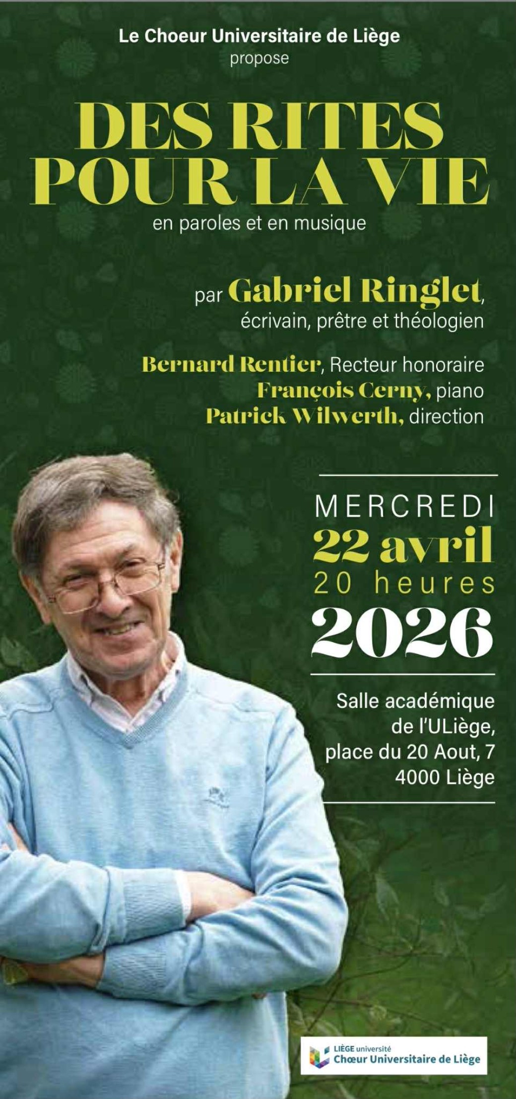 Choeur universitaire de Liège vous invite à une conférence musicalisée exceptionnelle : Gabriel Ringlet vous présente, dans un dialogue croisé, son livre "Des rites pour la vie".