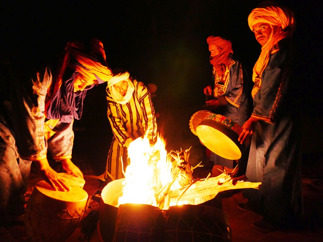 A magical time in the middle of the dunes in Merzouga Desert.