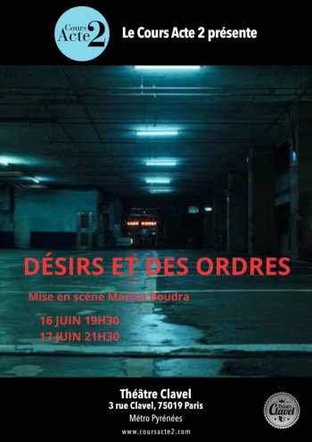 2026-06-16 19:30:00 2026-06-17 21:30:00 Europe/Paris Désirs et des ordres Reservations on : https://www.billetweb.fr/desirs-et-des-ordres -- Un spectacle de Marina Boudra   La pièce : 9 septembre 1914. La guerre a éclaté depuis 2 mois. Depuis la grande maison désertée, on entend les bombardements au loin. Un aristocrate resté seul avec son domestique se lasse glisser dans les affres de l'opium... Une pièce pour questionner la course au désir racontée à travers le destin d'hommes et de femmes voulant aveuglément croire à la réussite et au progrès social à grand coup de "self-made" et de croyance en soi.…   Avec : Caroline Adamy, Nicolas Biston, Mathieu Bouchet, Mathieu Creton, Maxime Despouy, Marion Drew, Tony Gallon, Thomas Guyot, Tristan Michel, Ladislas Levet, Valentin Pizon, Alice Vagniez, Rodolphe de Varine-Bohan, Carla Yamin.   ---   Cours Acte 2 Cours de théâtre pour adultes amateurs à Paris.  On apprend mieux en s’amusant ! Théâtre Clavel, Rue Clavel, Paris, France Cours Acte 2