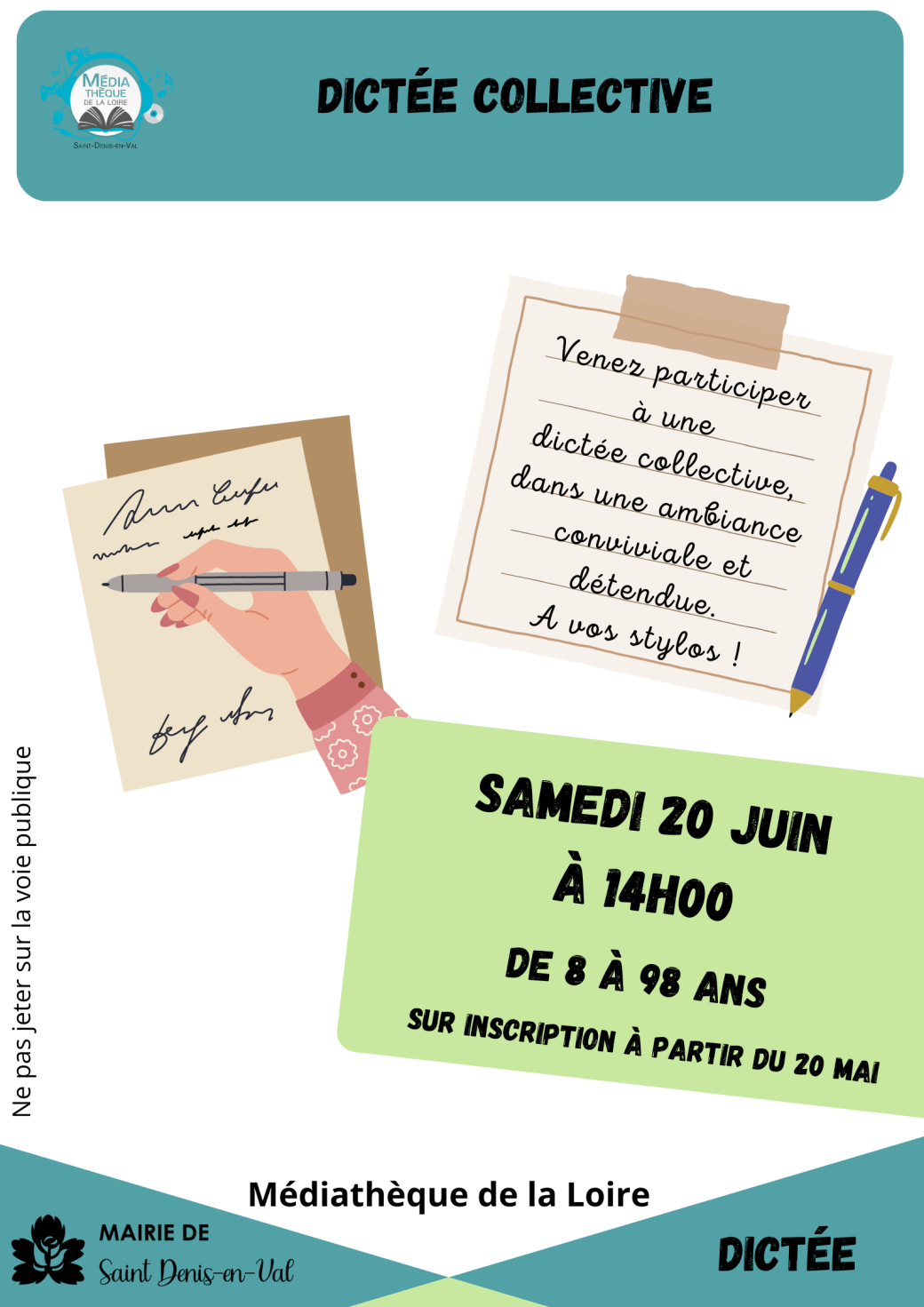 2026-06-20 14:00:002026-06-20 15:00:00Europe/ParisDictée collectiveReservations on : https://www.mediathequesaintdenisenval.net/
