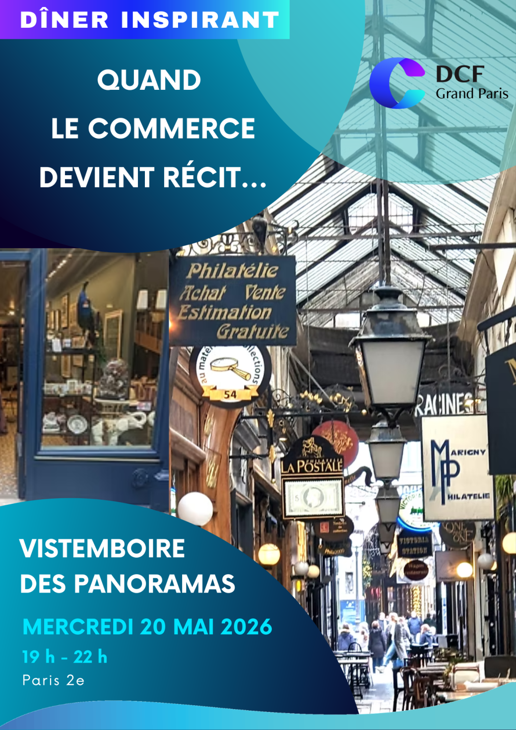 2026-05-20 19:00:00 2026-05-20 22:00:00 Europe/Paris Dîner Inspirant DCF Grand Paris 20 mai 2026 Reservations on : https://dcfgrandparis.reseau-dcf.fr/ -- Quand le commerce devient récit… Pour ce nouveau dîner inspirant, nous partons à l’aventure… Des passages mythiques à une maison qui raconte des histoires… authentiques, insolites, intéressantes et instructives ! Un dîner là où le commerce s’invente ! Ensemble découvrons le concept de « story-shop » et du modèle économique. Une soirée historique au coeur de l’un des premiers passages commerciaux couverts d’Europe , au Vistemboire des Panoramas. Le Vistemboire des Panoramas, Passage des Panoramas, Paris, France DCF Grand Paris