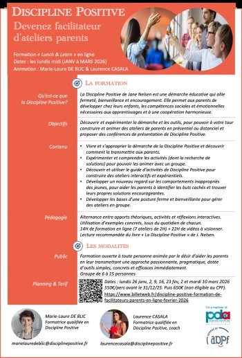 ![[Discipline Positive] Formation de Facilitateurs Parents en Ligne -  février 2026 [Discipline Positive] Formation de Facilitateurs Parents en Ligne -  février 2026](/files/page/thumb/discipline-positive-formation-de-facilitateurs-parents-en-ligne-fevrier-2026.jpg?v=1761574093)