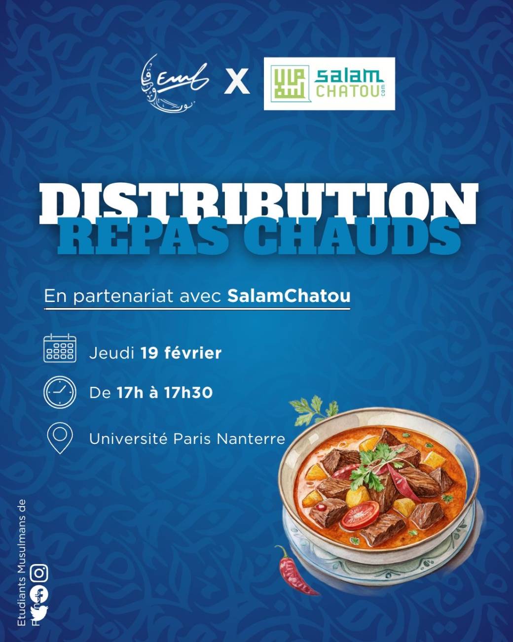 2026-02-19 17:00:002026-02-19 17:30:00Europe/ParisDistribution de repas chauds x SalamChatouReservations on : https://www.billetweb.fr/distribution-de-repas-chauds-x-salamchatou