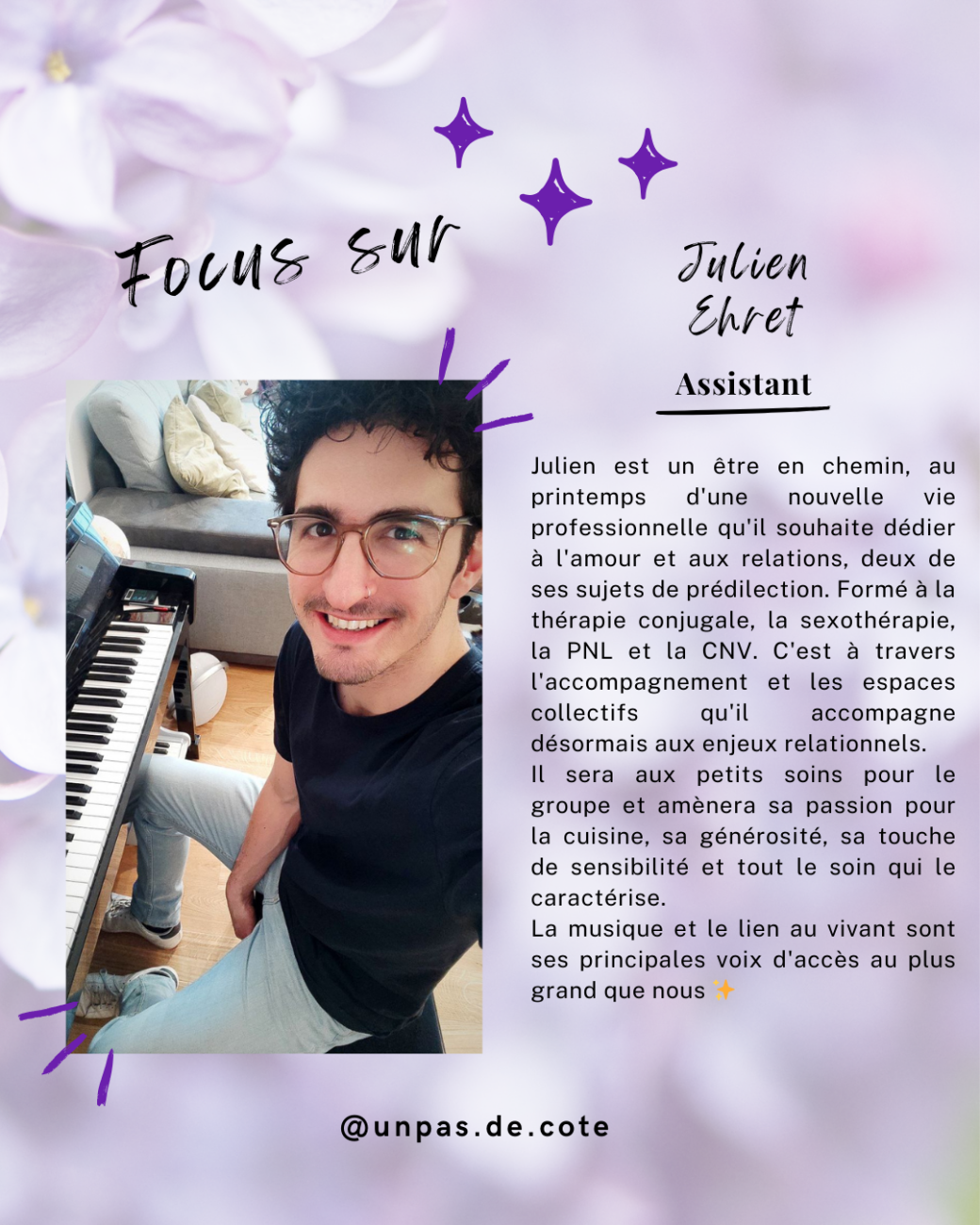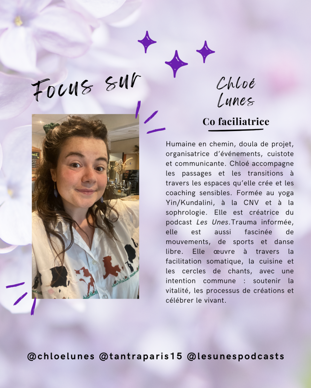 Formée notamment au yoga, à la CNV et à la sophrologie, elle est également créatrice du podcast Les Unes.